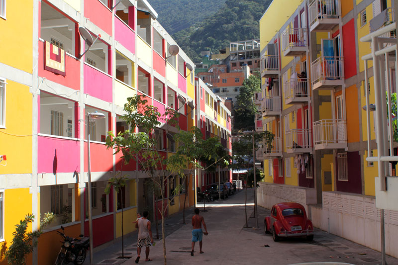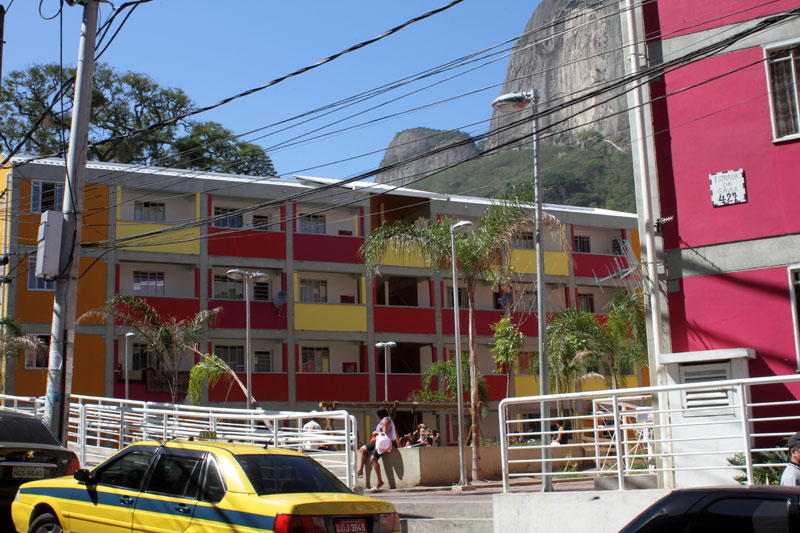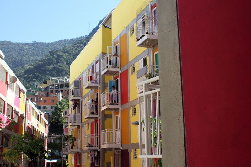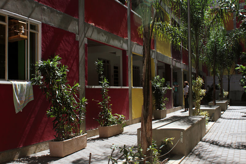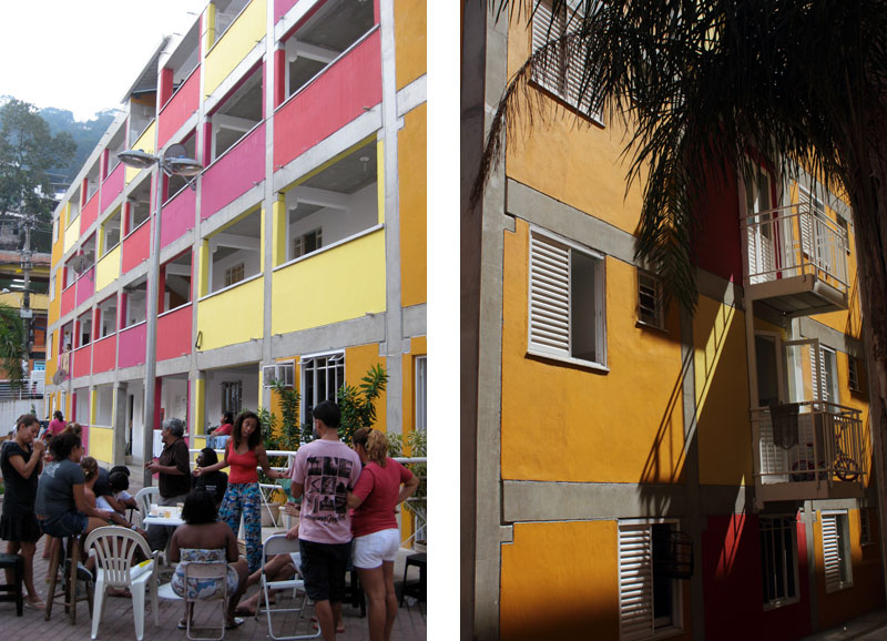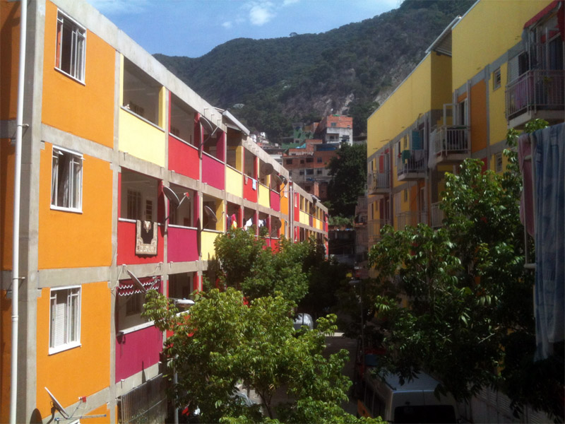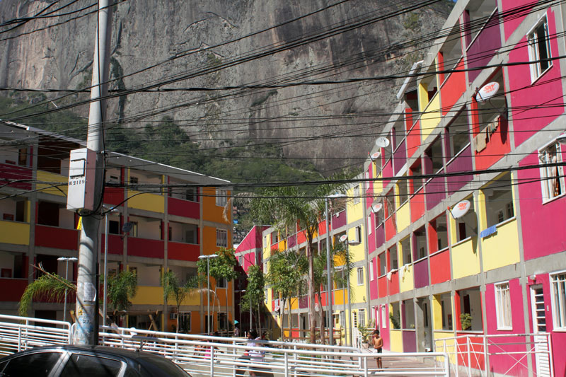 Encontro de duas lógicas Os processos atuais implicam um desafio para todos os "atores" da cidade: para os habitantes, obrigados a novos comportamentos, para os profissionais que tem que fazer evoluir as formas de conceber e intervir, e para os tomadores de decisões de interesse público, obrigados a orientar e arbitar em parcerias de projetos de grande complexidade abrangendo diversas escalas. Nas grandes metrópoles contemporâneas existe a necessidade de agrupar residências como estratégia urbana sustentável e por isso os núcleos habitacionais multi-familiares são um desafio vigente que desencadeiam novos cenários urbanístico-paisagístico-arquitetônicos. Os processos sociais demandam novos espaços habitacionais e a necessidade de densificar o uso do solo urbano para atender a essa necessidade. Magnitude e estratégia de inserção cumprem um importante papel como agentes de renovação urbana ajudando a configurar novos espaços de vida em consonância com a cidade contemporânea. Hoje resulta fundamental pensar os projetos em relação com o aporte urbano que podem realizar, a maneira como contribuem para "construir cidade", reconfigurando o lugar onde se inserem. A influência do projeto no espaço urbano pode ajudar a conseguir uma cidade mais amável, habitável e sustentável. A maneira na qual o projeto se implanta no terreno possibilita uma série de relações com o entorno, que activam formas de entender e recompor o espaço circundante. Os espaços de transição público-privado se convertem em recurso de design para estruturar agrupamentos que resignifiquem o lugar. Num entorno consolidado, um vazio urbano é utilizado para relocalizar habitantes deslocados pelo alargamento de uma viela, transformada agora em rua carroçável. O terreno ocupado por um estacionamento privado de ônibus é desapropriado pela Prefeitura para a criação desta nova centralidade constituída por unidades habitacionais em edificações de pavimento térreo e três andares superiores. O novo núcleo é estruturado mediante uma sequência de pátios, praças e espaços de convivência de diferentes dimensões, permeáveis e abertos ao entorno, permitindo diversas formas de penetração, atravessamento e permanência. Este centro habitacional com a sua praça voltada para a rua principal (a Estrada da Gávea) constitui agora um novo ponto de referência na comunidade, claramente perceptível tanto do ponto de vista do pedestre que circula pelas ruas perimetrais, quanto desde os diversos pontos de observação oferecidos pela topografia do lugar que permite visuais desde o topo dos morros circundantes. Partindo da leitura da estrutura do lugar buscou-se "compor" com o existente, nem em oposição, nem mimeticamente, procurando uma "inserção soft" no contexto, provocando continuidade. Na Rocinha a incorporação ao contexto se da através da correspondência de alturas, do uso das cores, das relações cheio-vazio no corpo das edificações; do uso dos materiais, do tratamento das bordas do construído, da incorporação de jardins e de espaços de uso coletivo abertos, da criação de novos acessos, da praça de articulação com o resto da favela, e do alargamento da rua 4. O uso da cor na cultura popular está associado à ideia de beleza.