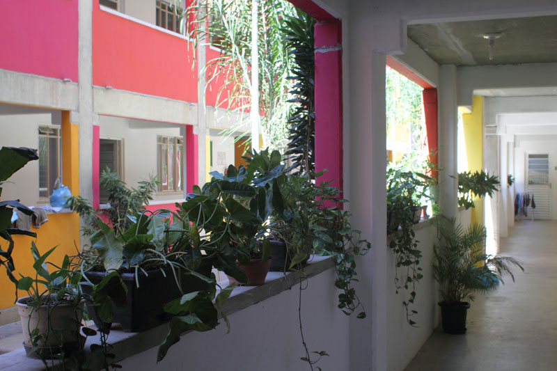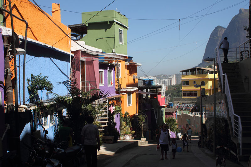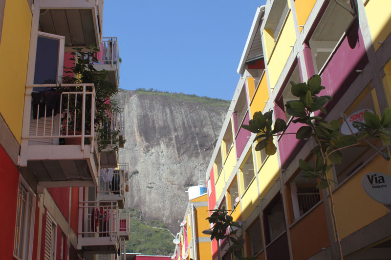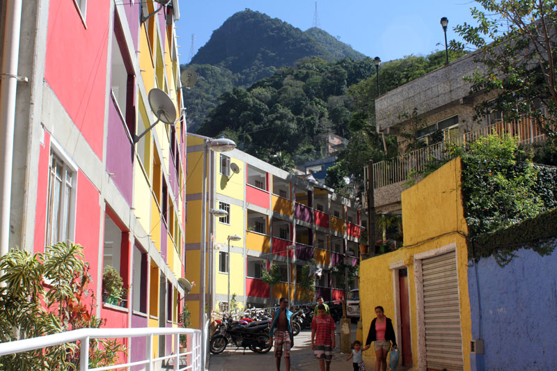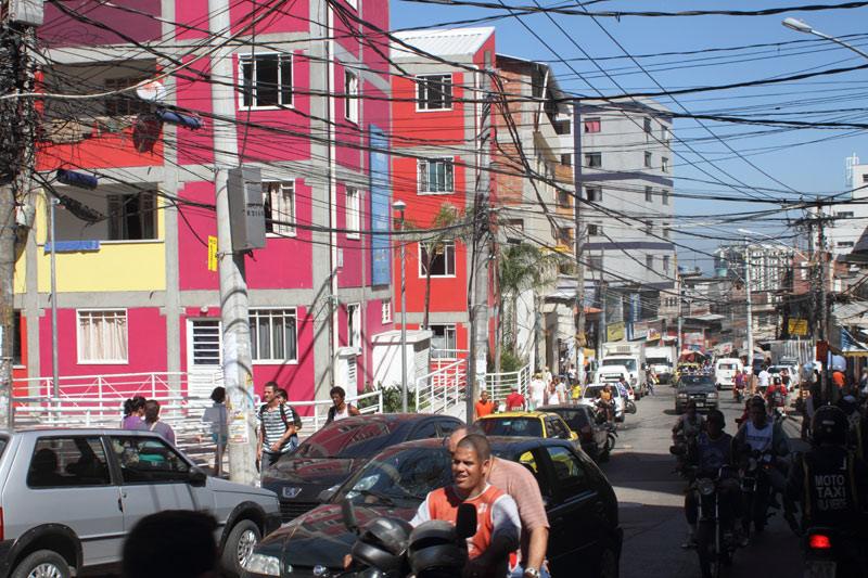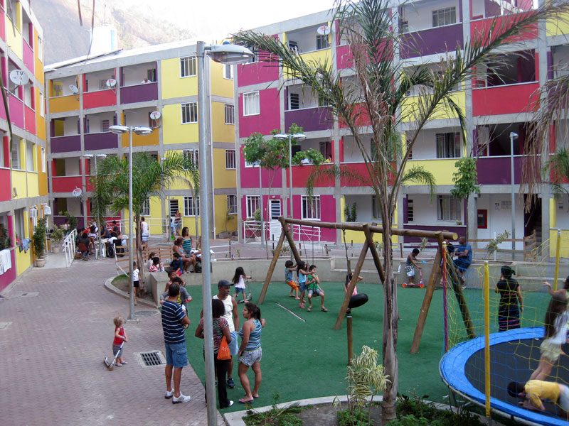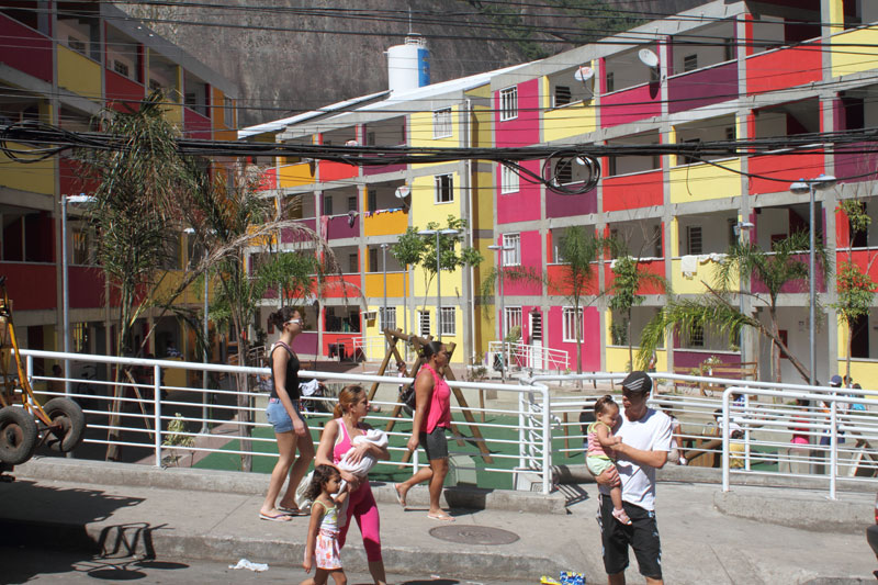 Encontro de duas lógicas Os processos atuais implicam um desafio para todos os "atores" da cidade: para os habitantes, obrigados a novos comportamentos, para os profissionais que tem que fazer evoluir as formas de conceber e intervir, e para os tomadores de decisões de interesse público, obrigados a orientar e arbitar em parcerias de projetos de grande complexidade abrangendo diversas escalas. Nas grandes metrópoles contemporâneas existe a necessidade de agrupar residências como estratégia urbana sustentável e por isso os núcleos habitacionais multi-familiares são um desafio vigente que desencadeiam novos cenários urbanístico-paisagístico-arquitetônicos. Os processos sociais demandam novos espaços habitacionais e a necessidade de densificar o uso do solo urbano para atender a essa necessidade. Magnitude e estratégia de inserção cumprem um importante papel como agentes de renovação urbana ajudando a configurar novos espaços de vida em consonância com a cidade contemporânea. Hoje resulta fundamental pensar os projetos em relação com o aporte urbano que podem realizar, a maneira como contribuem para "construir cidade", reconfigurando o lugar onde se inserem. A influência do projeto no espaço urbano pode ajudar a conseguir uma cidade mais amável, habitável e sustentável. A maneira na qual o projeto se implanta no terreno possibilita uma série de relações com o entorno, que activam formas de entender e recompor o espaço circundante. Os espaços de transição público-privado se convertem em recurso de design para estruturar agrupamentos que resignifiquem o lugar. Num entorno consolidado, um vazio urbano é utilizado para relocalizar habitantes deslocados pelo alargamento de uma viela, transformada agora em rua carroçável. O terreno ocupado por um estacionamento privado de ônibus é desapropriado pela Prefeitura para a criação desta nova centralidade constituída por unidades habitacionais em edificações de pavimento térreo e três andares superiores. O novo núcleo é estruturado mediante uma sequência de pátios, praças e espaços de convivência de diferentes dimensões, permeáveis e abertos ao entorno, permitindo diversas formas de penetração, atravessamento e permanência. Este centro habitacional com a sua praça voltada para a rua principal (a Estrada da Gávea) constitui agora um novo ponto de referência na comunidade, claramente perceptível tanto do ponto de vista do pedestre que circula pelas ruas perimetrais, quanto desde os diversos pontos de observação oferecidos pela topografia do lugar que permite visuais desde o topo dos morros circundantes. Partindo da leitura da estrutura do lugar buscou-se "compor" com o existente, nem em oposição, nem mimeticamente, procurando uma "inserção soft" no contexto, provocando continuidade. Na Rocinha a incorporação ao contexto se da através da correspondência de alturas, do uso das cores, das relações cheio-vazio no corpo das edificações; do uso dos materiais, do tratamento das bordas do construído, da incorporação de jardins e de espaços de uso coletivo abertos, da criação de novos acessos, da praça de articulação com o resto da favela, e do alargamento da rua 4. O uso da cor na cultura popular está associado à ideia de beleza.